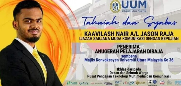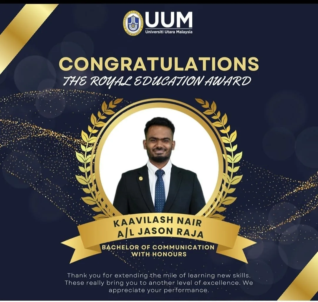 Kaavilash Nair Jason Raj has been honoured with the Royal Education Award by the University Utara Malaysia, Kedah. He is the first ever Malaysian Indian to be a recipient of such a prestigious academic recognition. 24-year-old Kaavilash has always been a dedicated and well-rounded student and exemplary individual. Starting from his secondary school education at SMK Methodist, where he completed his SPM, to his Form Six studies at the Forest Heights Form Six College, right up to earning his Bachelor of Communication with Honours, graduating with a first-class distinction with a 3.86 GPA, at the University Utara Malaysia, Kaavilash has remained principled, unwavering, and unrelenting in his pursuit and drive for academic excellence.