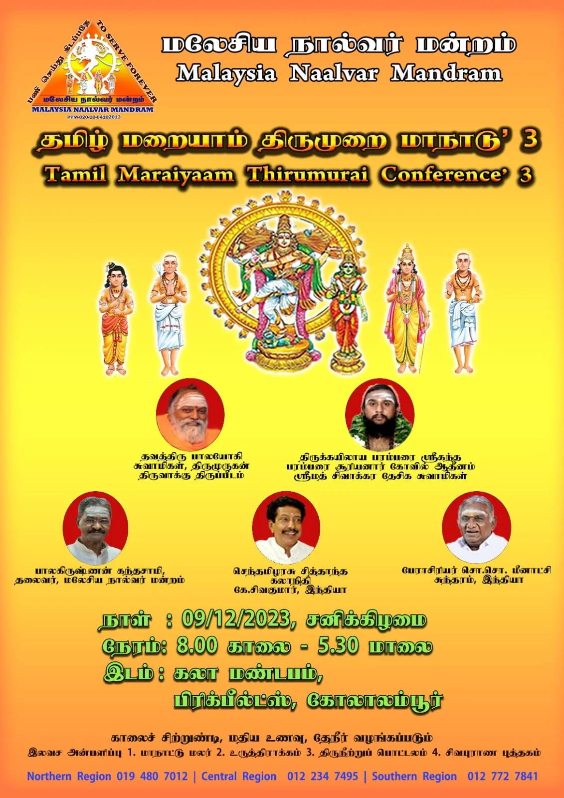 The first and second conferences occurred in 2014 and 2018, respectively, with the upcoming conference scheduled for 2023. The registration fee for this event is RM80. Datuk Seri M. Saravanan is set to officiate the conference organised by Malaysia Naalvar Mandram. The attendees will be provided with breakfast, lunch, tea break, magazine of the conference, ruthratcham, packet of Thiruneer and a Sivapuraanam book as well.