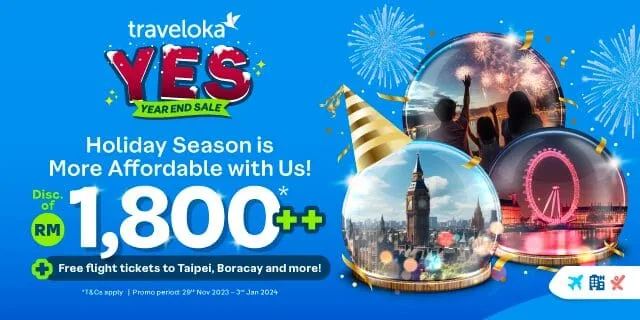 Traveloka Malaysia is closing 2023 and welcoming the New Year with a Year End Sale campaign that promises incredible online and offline travel discounts of more than RM1,800. Experience the joy of the holiday season with complimentary treats, including free flight tickets to exciting destinations like Taipei, Boracay, and Penang. Indulge in luxurious hotel stays at renowned establishments such as The George in George Town, Penang. Additionally, revel in exclusive offers from well-known brands, including the globally acclaimed Madame Tussauds wax museum. Embrace the festive spirit with these delightful giveaways and create lasting memories. The campaign commences 29 November 2023 and ends 3 January 2024.