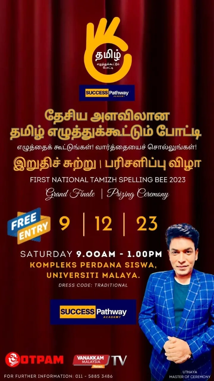 Under the organisation of Success Pathway Academy. The National National Level Tamil Spelling Bee 2023 Grand Final has successfully taken place at the Perdanasiswa Complex in the University of Malaya on December 9, 2023. When the competition was first organized, it was initially only expected to have 30 participating students, but the overwhelming enthusiasm and support of the students for the competition had seen almost 1519 participants compete in this wonderful event.