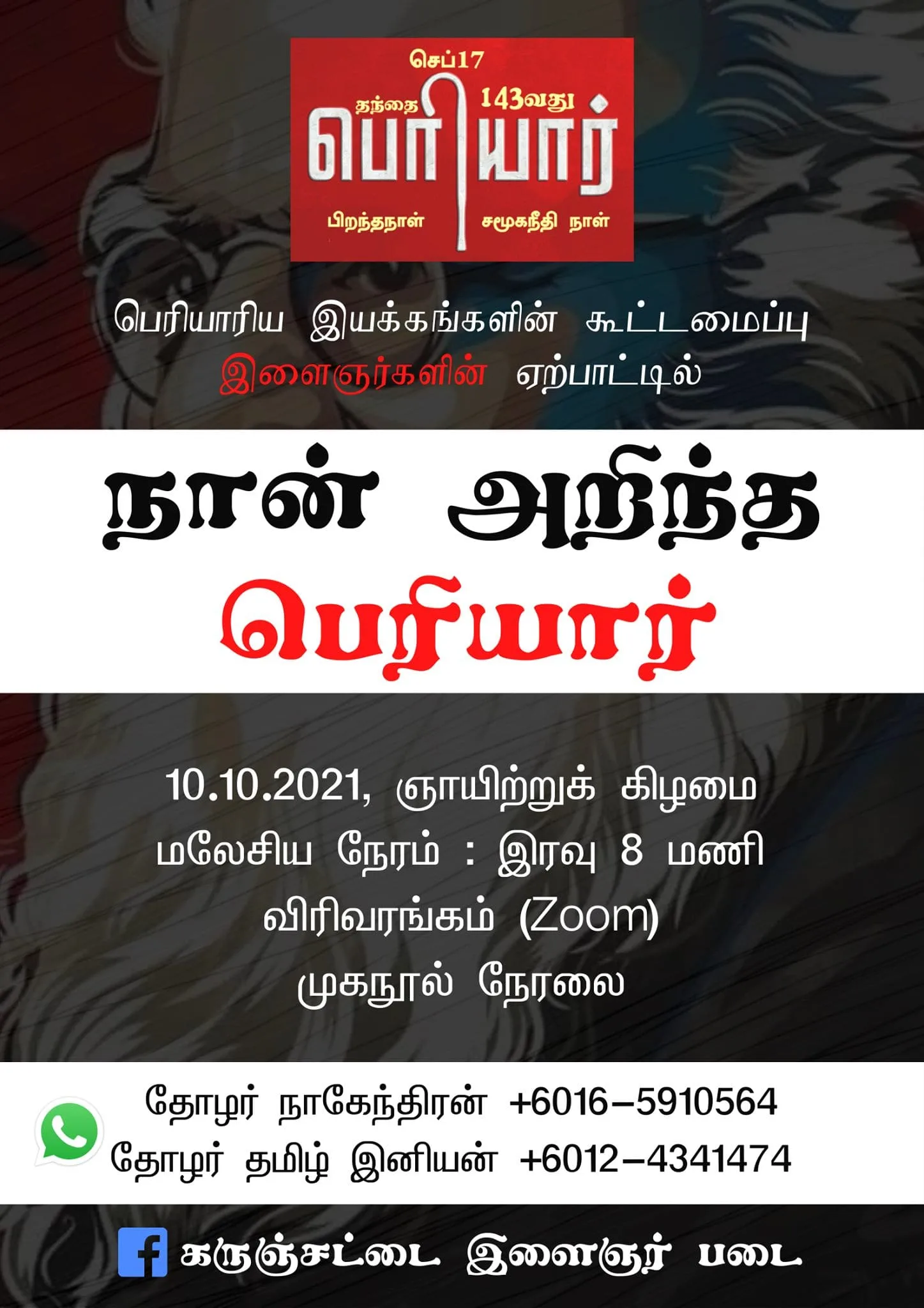 Naan Arintha Periyar was the first event that brought together the Karuncchattai Ilaignar Padai, whereby they organised a productive forum for youngsters who were interested in Periyar but were not affiliated with any Dravidian associations. to discuss and express their thoughts on the reformist, his politics, and philosophy, in the form of speech or poetry. The event had seen overwhelming support from the young generation, which gave them even more encouragement to continue doing more events focused on Periyar’s ideology that still lives within the hearts of Tamils in Malaysia.