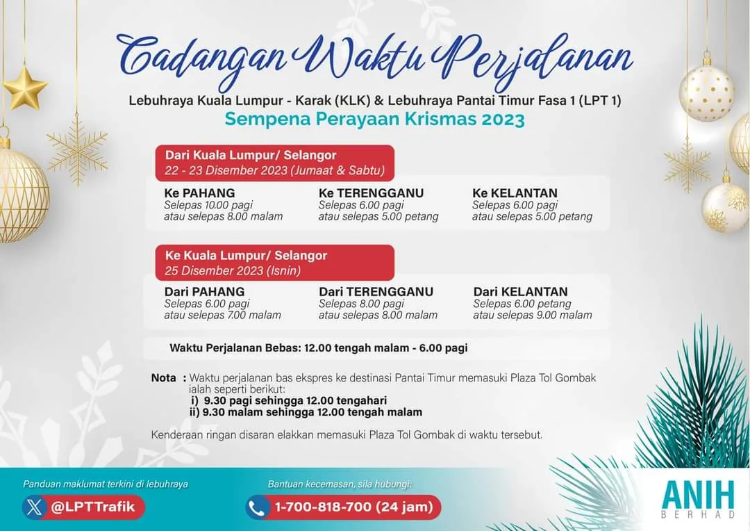 ANIH Berhad, the concessionaire of the Kuala Lumpur – Karak Highway (KLK) and the East Coast Expressway Phase 1 (LPT 1), is actively enhancing its operational preparedness to manage the anticipated increase in traffic during the upcoming Christmas holiday season.