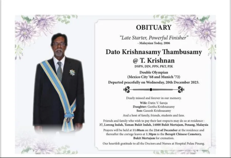 The accomplished Olympian Datuk Thambu Krishnan has passed away at the age of 79 after a brief illness yesterday in Penang. Krishnan, a formidable competitor who posed a strong challenge to legends such as Dr. Mani Jegathesan, succumbed to a lung infection yesterday at Penang General Hospital.