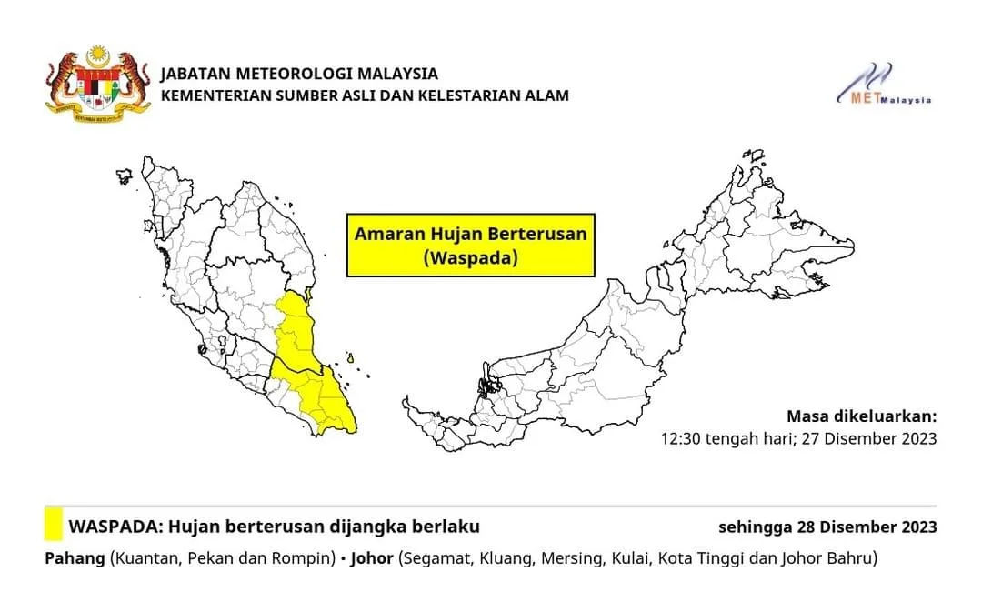 In response to the continuous rainfall warning issued by the Malaysian Meteorological Department (MetMalaysia) at 12:30pm today for various regions in Pahang and Johor, the National Disaster Management Agency (NADMA) has instructed the activation of state and district disaster management committees in these areas. This precautionary measure is being taken to ensure preparedness and effective coordination in light of the heightened alert level due to the persistent rain.