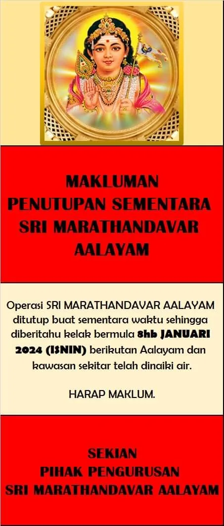 The Sri Marathandavar Temple, located in Maran, Pahang, stands as a renowned sanctuary devoted to Lord Murugan within the country. Particularly celebrated for its grand ‘Panguni Uthiram‘ festival, the temple holds significant cultural and religious importance. However, regrettably, today, on the 8th of January 2024, the temple’s official Facebook page has issued a notice from the management, revealing the temporary closure of the temple.