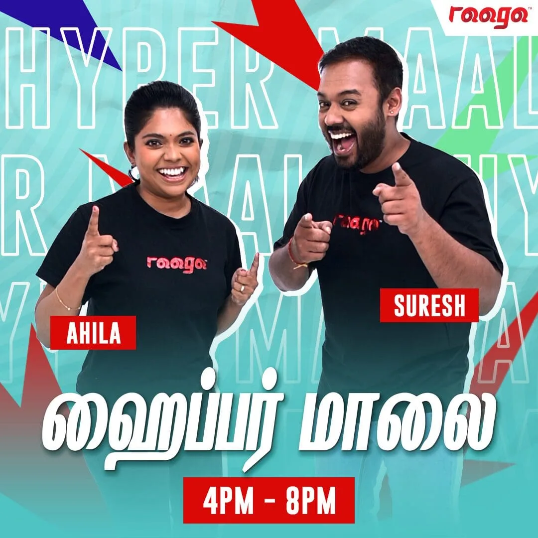 Suresh and Ahila are set to take the reins of Hyper Maalai from 4pm to 8pm, delivering a blend of fantastic music and essential traffic updates. This dynamic duo aims to entertain listeners while ensuring they stay well-informed for their travel plans. The lively and engaging style that characterized their hosting of Kalakkal Kaalai will persist, promising a continuation of the enjoyable experience for the audience.