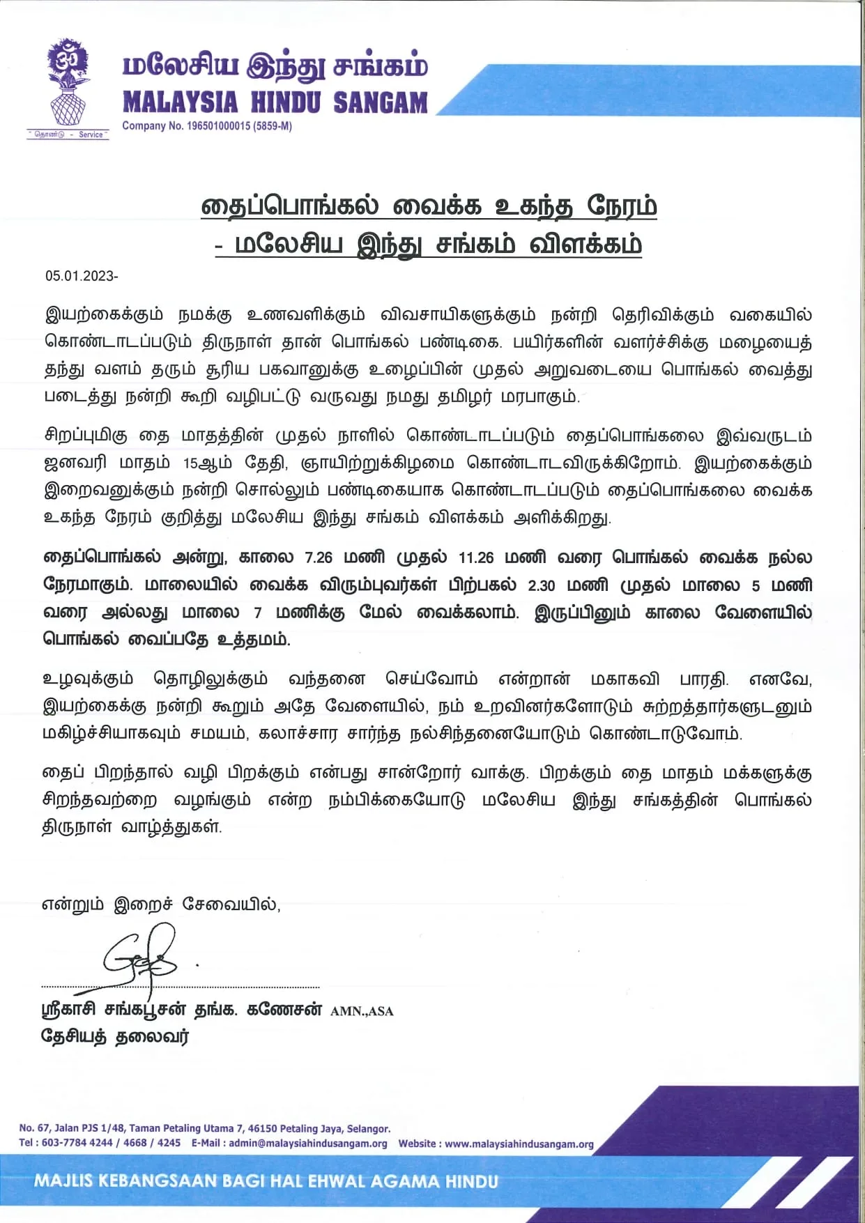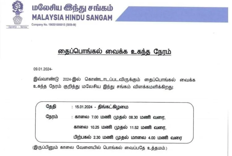 Previously, the Malaysia Hindu Sangam provided the auspicious timings for performing the Pongal ritual. It has been a customary practice among Indians to carefully observe these timings and ensure that the ritual is conducted within the specified periods. In that case, earlier Malaysia Hindu Sangam had stated that the auspicious time for ritual is: