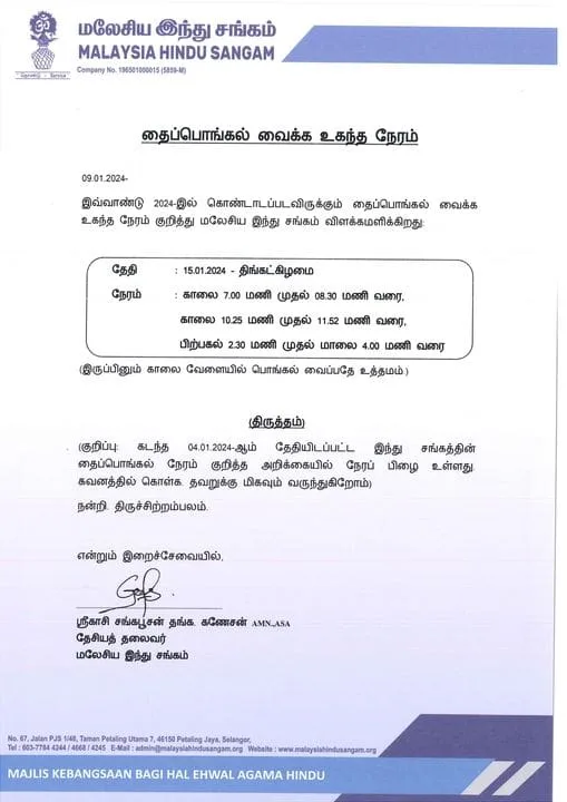 The Malaysia Hindu Sangam has thoughtfully provided revised auspicious timings for Pongal, rectifying an earlier error. Emphasizing the auspiciousness of preparing Pongal in the morning, individuals are encouraged to take note of these updated timings. May this guidance contribute to a harmonious and prosperous celebration. Have a blessed Pongal!