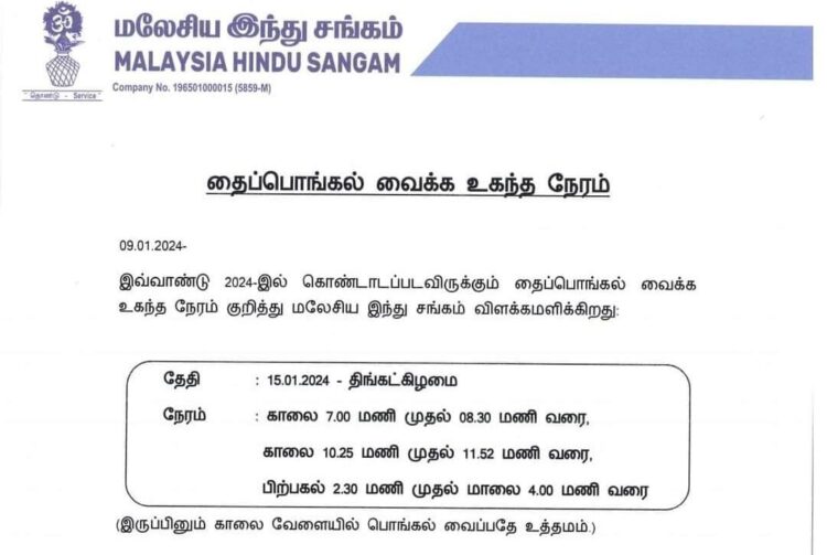 Previously, the Malaysia Hindu Sangam provided the auspicious timings for performing the Pongal ritual. It has been a customary practice among Indians to carefully observe these timings and ensure that the ritual is conducted within the specified periods. In that case, earlier Malaysia Hindu Sangam had stated that the auspicious time for ritual is: