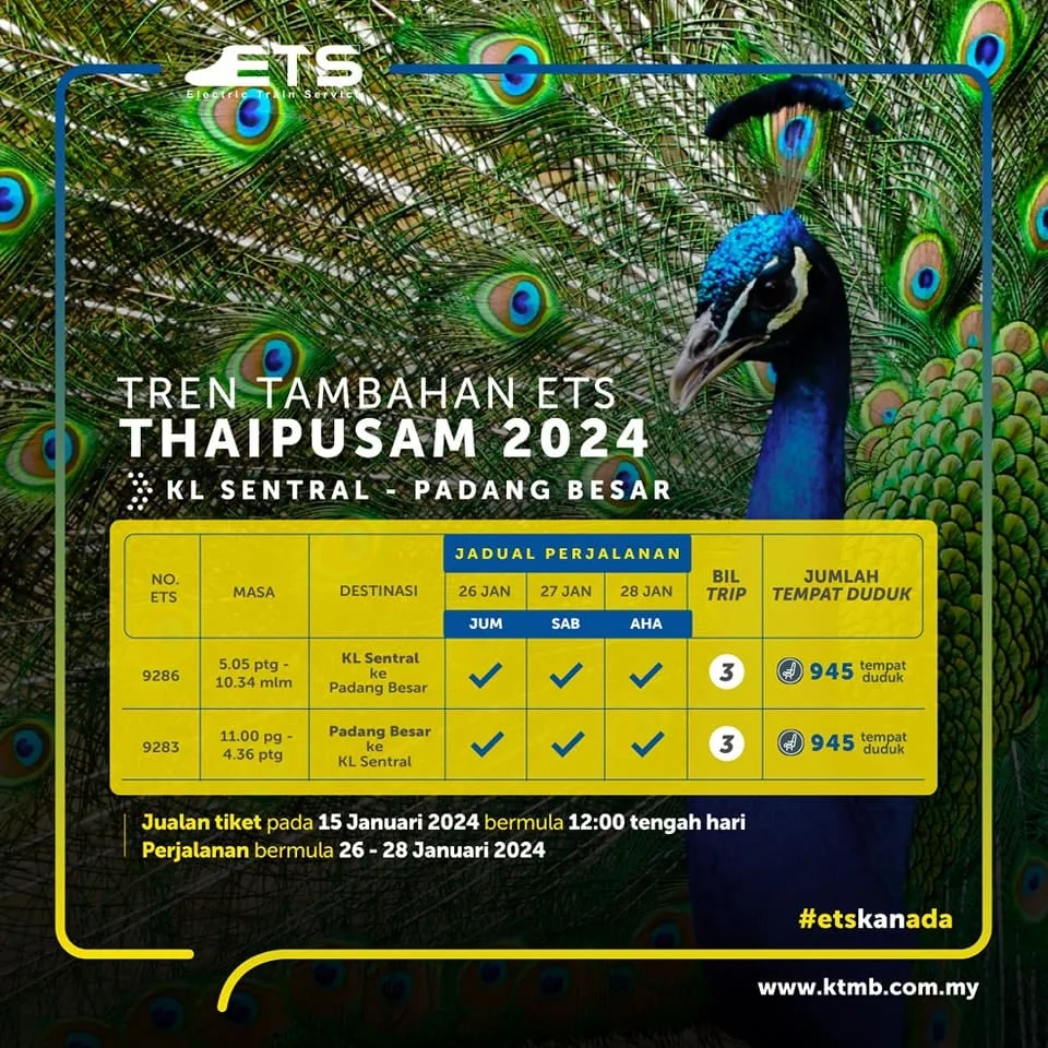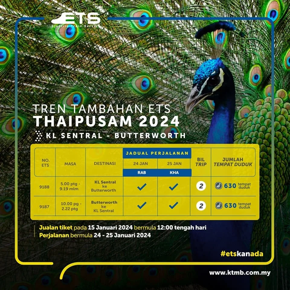To facilitate travel between the Central Zone and Northern Zone of the Peninsula, KTMB is also offering four additional ETS services with an additional ticket capacity of 3,150 from January 24th to January 28th. The details are as follows:
