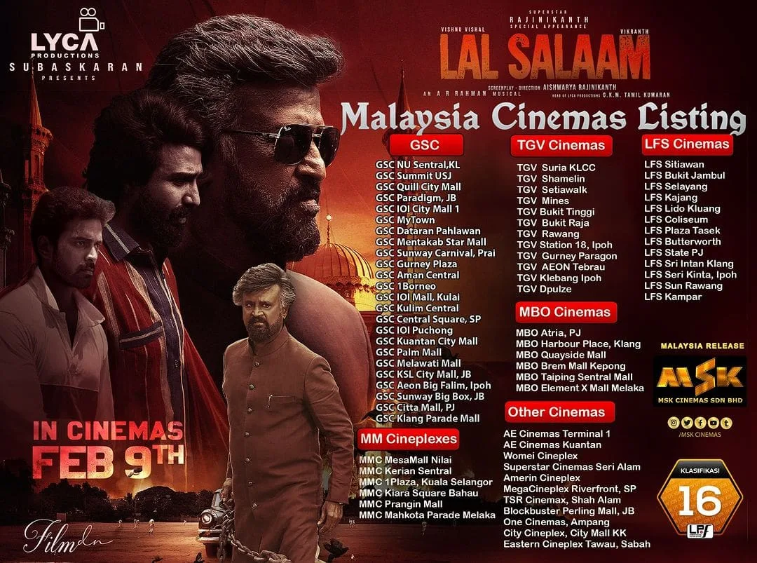 In Malaysia, the movie was distributed by MSK Cinemas. The Gala Screening of “Lal Salaam” happened at Quill City Mall, Kuala Lumpur. “Lal Salaam” intricately explores the central conflict between two childhood friends who, despite their familial ties, have grown up disliking each other and considering themselves as enemies. The narrative centers around their shared passion for cricket, with one protagonist hailing from a Hindu background, portrayed by Vishnu Vishal as Thiru, and the other from a Muslim upbringing, played by Vikranth in the role of Samsudeen.