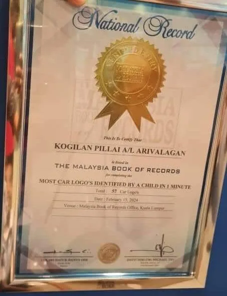 Kogilan Pillai, an exceptional 6-year-old prodigy hailing from Nilai, Negeri Sembilan, has solidified his place in the Malaysia Book of Records by attaining the title of “Most Car Logos Identified by a Child in 1 Minute.” This remarkable achievement highlights Kogilan’s extraordinary talent, as he adeptly identified an impressive total of 57 car logos within the short span of just one minute. This outstanding feat is particularly noteworthy, considering Kogilan’s tender age of six.