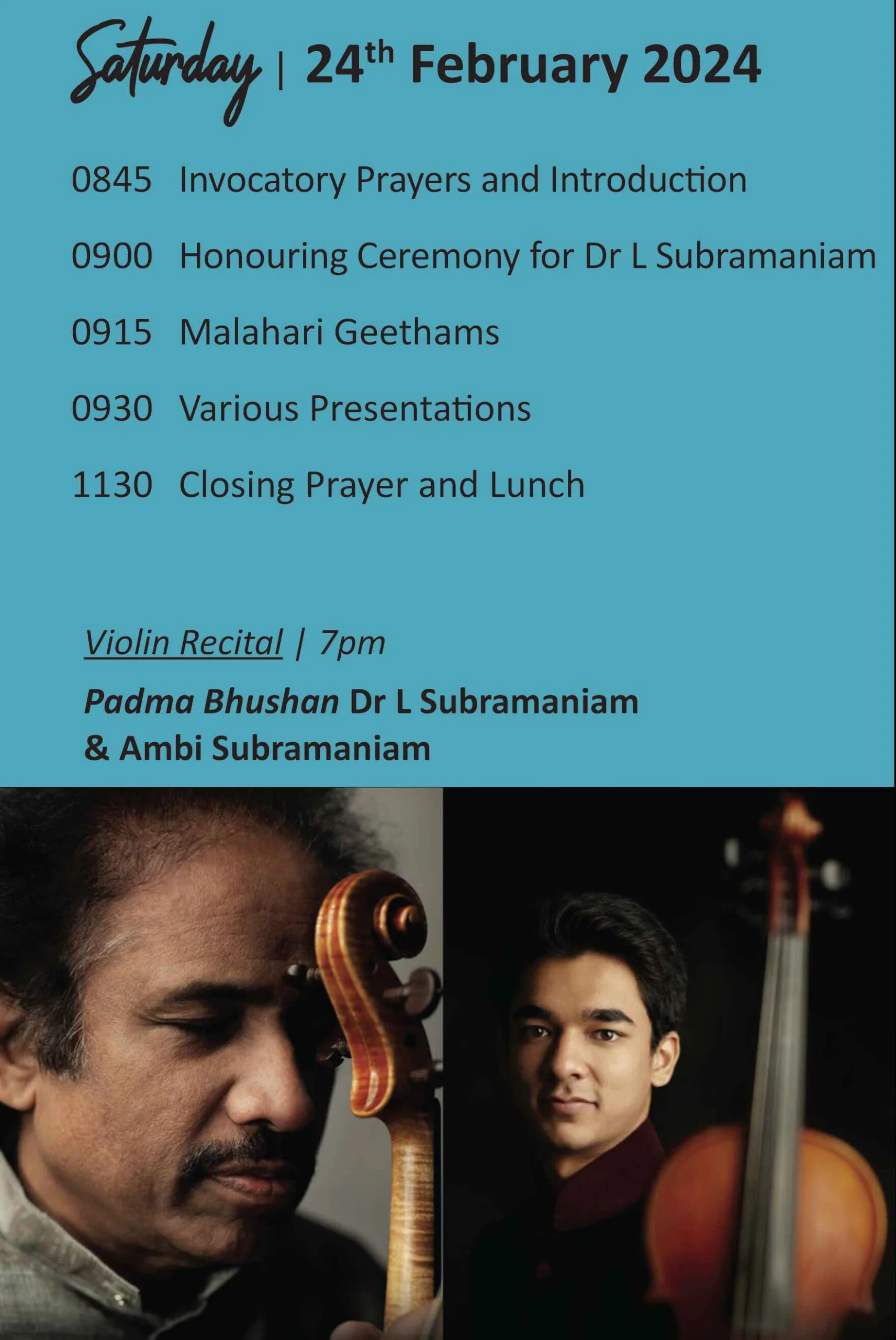 On the evening of February 24th, the stage will come alive with a Carnatic Violin duet featuring the globally acclaimed Padma Bhushan Dr. L. Subramaniam and his son Ambi Subramaniam. Accompanied by talented artists V.V. Ramana Murthy, Tripoonithura N. Radhakrishnan, and Ghantasala Satya Sai, the performance promises an enchanting musical journey.