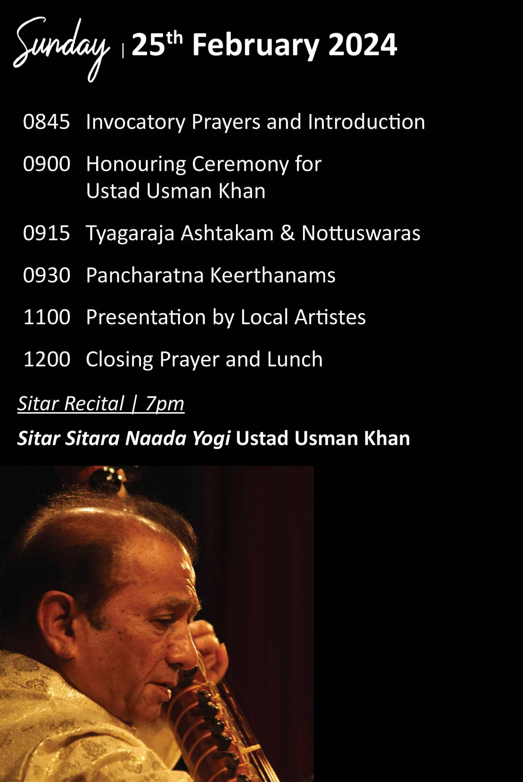 The crescendo continues on February 25th with a captivating Sitar solo by the esteemed Ustad Usman Khan, accompanied by Malaysia’s tabla artist, Prakash Kandasamy. Immerse yourself in the poetic and soul-stirring sounds of the Sitar, as Ustad Usman Khan weaves a musical tapestry transcending boundaries.