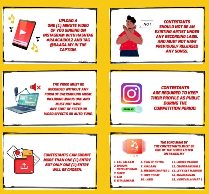 - Submission Process: Upload video on Instagram with #raagaidol2, tag @raaga.my, set account to public during the contest period.