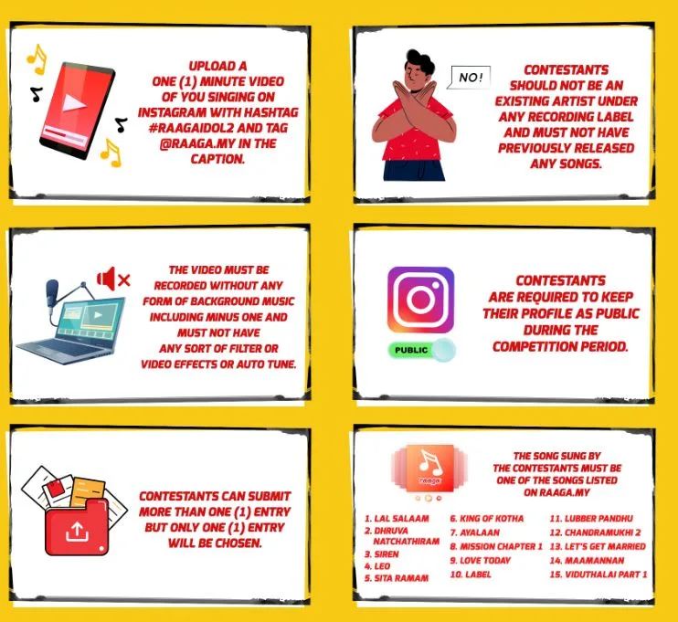 - Submission Process: Upload video on Instagram with #raagaidol2, tag @raaga.my, set account to public during the contest period.