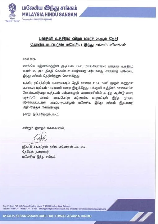 According to the “Vaakiya Panchangam”, the Malaysia Hindu Sangam has officially announced that Panguni Uthiram for this year is slated to be celebrated on the 25th of March 2024 in Malaysia. The “Vaakiya Panchangam”, a revered astrological and religious calendar, plays a pivotal role in determining the auspicious timings for various Hindu festivals, ensuring alignment with celestial events. This announcement from the Malaysia Hindu Sangam serves as a formal declaration, guiding the Hindu community in Malaysia to mark their calendars and make preparations for the forthcoming Panguni Uthiram celebrations on the specified date.
