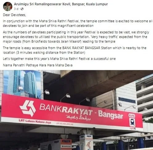 The Ramalingeswarar Temple in Bangsar is widely recognized, and due to its central location along a busy town road, the temple administration encourages devotees to opt for public transportation to avoid potential traffic congestion. The temple has thoughtfully provided a designated route for devotees to access the temple conveniently through public transportation.