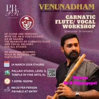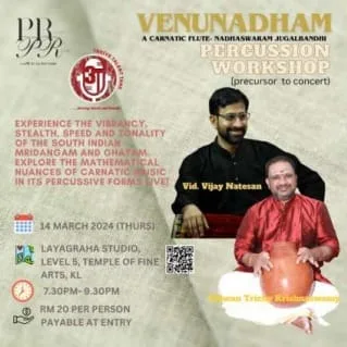 PR Events and Thrive Talent Tank are committed to strengthening the local Malaysian music fraternity. In line with this mission, a series of three workshops – Carnatic flute/vocal, Nathaswaram, and percussion – will be held today, on the evening of March 14, 2024, by the visiting artists. Furthermore, the concert itself will feature an opening Malaysian segment, in collaboration with iCAN (Indian Classical Artiste Network), Malaysia’s largest NGO encompassing Indian classical dance and music practitioners nationwide. PR Events and Thrive Talent Tank will also collaborate with The Temple of Fine Arts, Kuala Lumpur, and the Nethaji Subash Chandra Bose Indian Cultural Centre, KL, for the workshops.