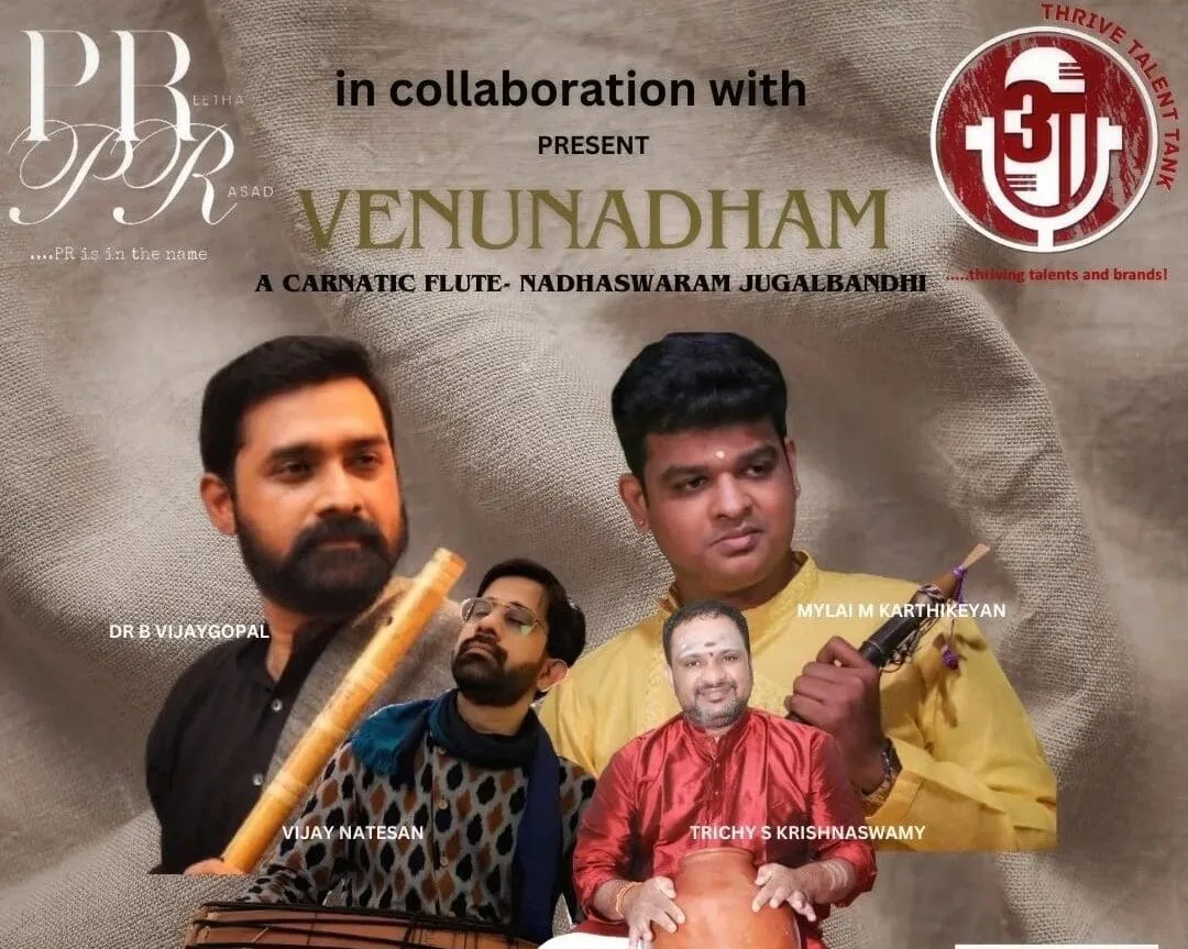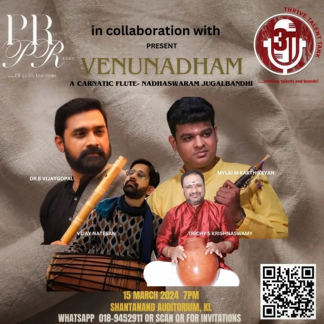 PR Events, founded by Carnatic vocalist and songstress Preetha Prasad, specializes in curating multi-genre music concerts and events in Malaysia. Preetha Prasad is a renowned singer in Malaysia, having participated in numerous productions, recordings, concerts, and performances. Thrive Talent Tank, a prominent artist management and production company, is owned by Malaysia’s senior mridangam artist and pharmacist, Dr. Sivabalan Shanmuga Sundram. ‘Venunadham’ marks their inaugural concert featuring international artists to be held in Malaysia.