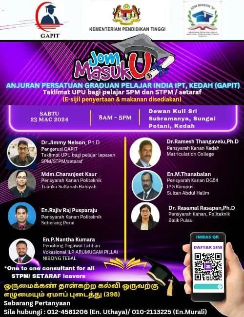 The programme will feature distinguished professionals such as Dr. Jimmy Nelson, Ph.D., President of GAPIT; Dr. Ramesh Thangavelu, Ph.D., Senior Lecturer at Kedah Matriculation College; and N. M. Thanabalan, Senior Lecturer at the DG54 IPG Campus of Sultan Abdul Halim. Their expertise and insights promise to inspire and empower students as they embark on their academic journeys.