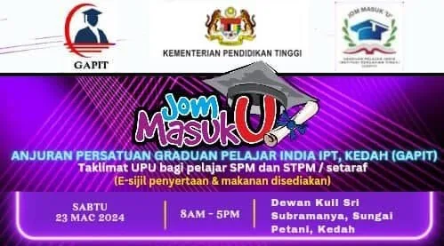 GAPIT (Persatuan Graduan Pelajar India Institusi Pengajian Tinggi) has organised an education programme aimed at providing one-on-one consultations for Indian STPM holders and those with equivalent qualifications, offering invaluable guidance for their higher education journey. The event will take place on March 23, 2024, from 8 a.m. to 5 p.m. at the Sri Subramanya Temple Hall in Sungai Petani, Kedah.