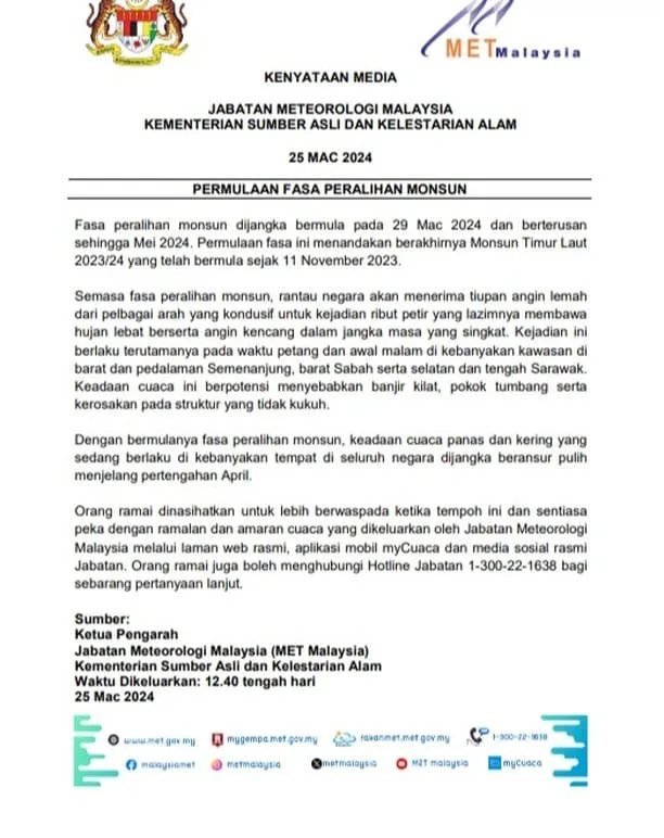 According to Maqrun Fadzli Mohd Fahmi, the director of the National Weather and Geophysics Operation Centre, this stage occurs when the prevailing wind direction changes from the northeast to the southwest monsoon. During the monsoon transition phase, wind patterns typically result in thunderstorm activity in the late afternoon. It is anticipated that this weather pattern will commence around early April.