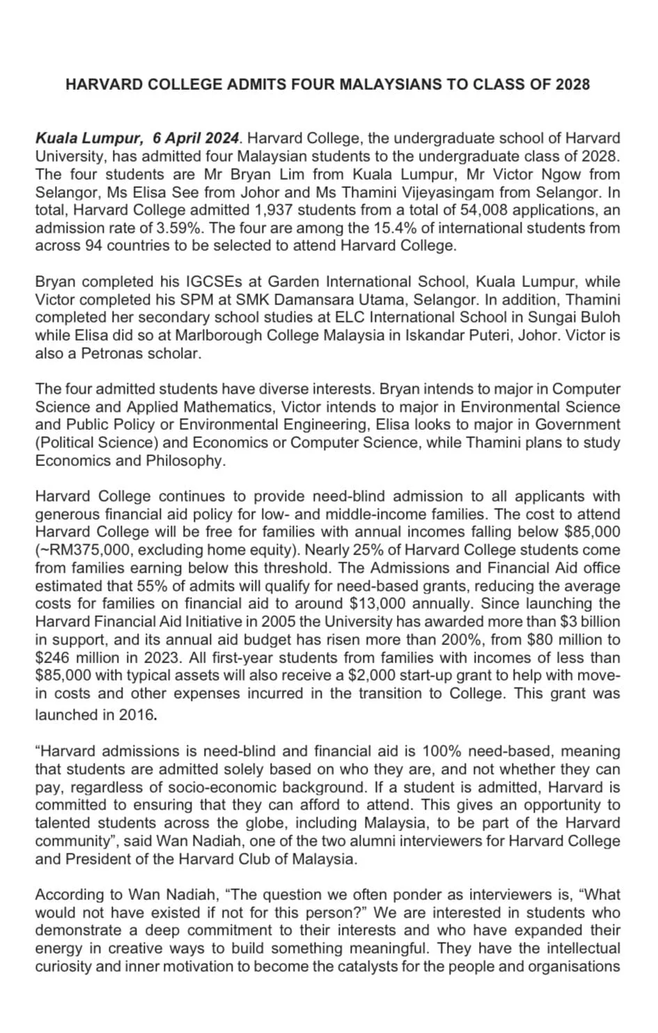 Harvard University, the oldest higher education institution in the United States, is widely recognized as one of the world’s top institutions, ranking fourth in the QS World University Rankings 2024.Their accomplishments not only make their families and communities proud, but they also demonstrate how Malaysian talent is recognized internationally on esteemed academic platforms.