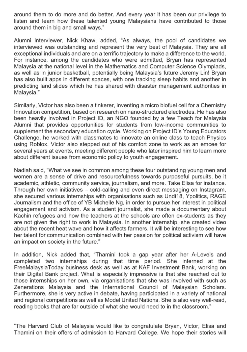 In a statement, Nadiah Wan of the Harvard Club of Malaysia said the other three selected students were Lim, an IGCSE student at Garden International School, Ngow, an SPM student at SMK Damansara Utama, and See, who graduated from Marlborough College Malaysia. Lim wants to major in computer science and applied mathematics; Ngow will pursue either environmental science and public policy or environmental engineering; and See intends to major in government (political science) and economics or computer science.