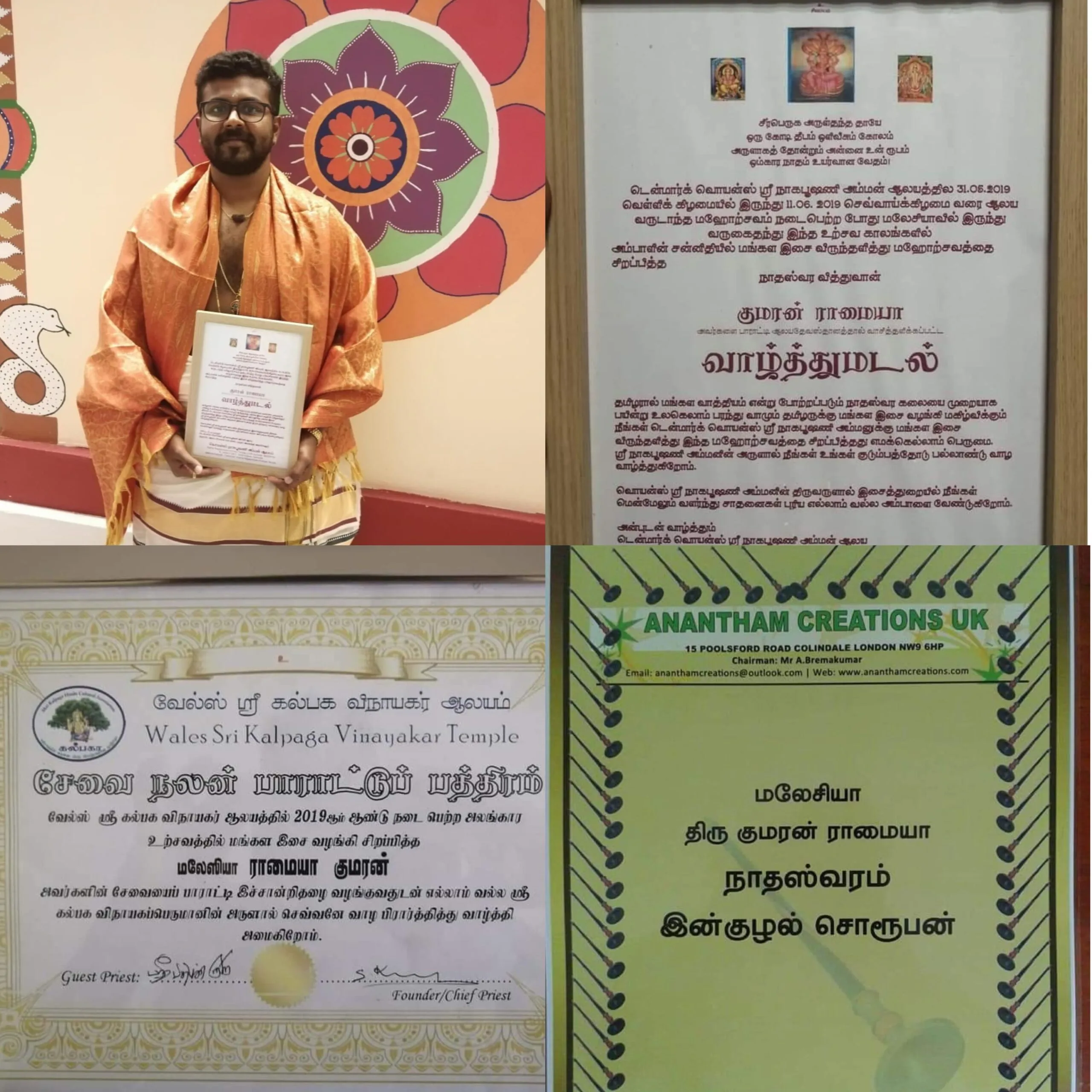He was awarded the title NADASWARA LAYAMANI by the Greentown Indian Cultural Society in Ipoh in 2006, and in June 2014, he got the “Nadhaswara ENKUZHAL SORUBAN” award from AnanthamCreations UK.In June 2016, he was honored as “Nadhaswara SWARANAATHA BAANU” at the Sri Karpagar Vinayakar temple in Wales, United Kingdom.