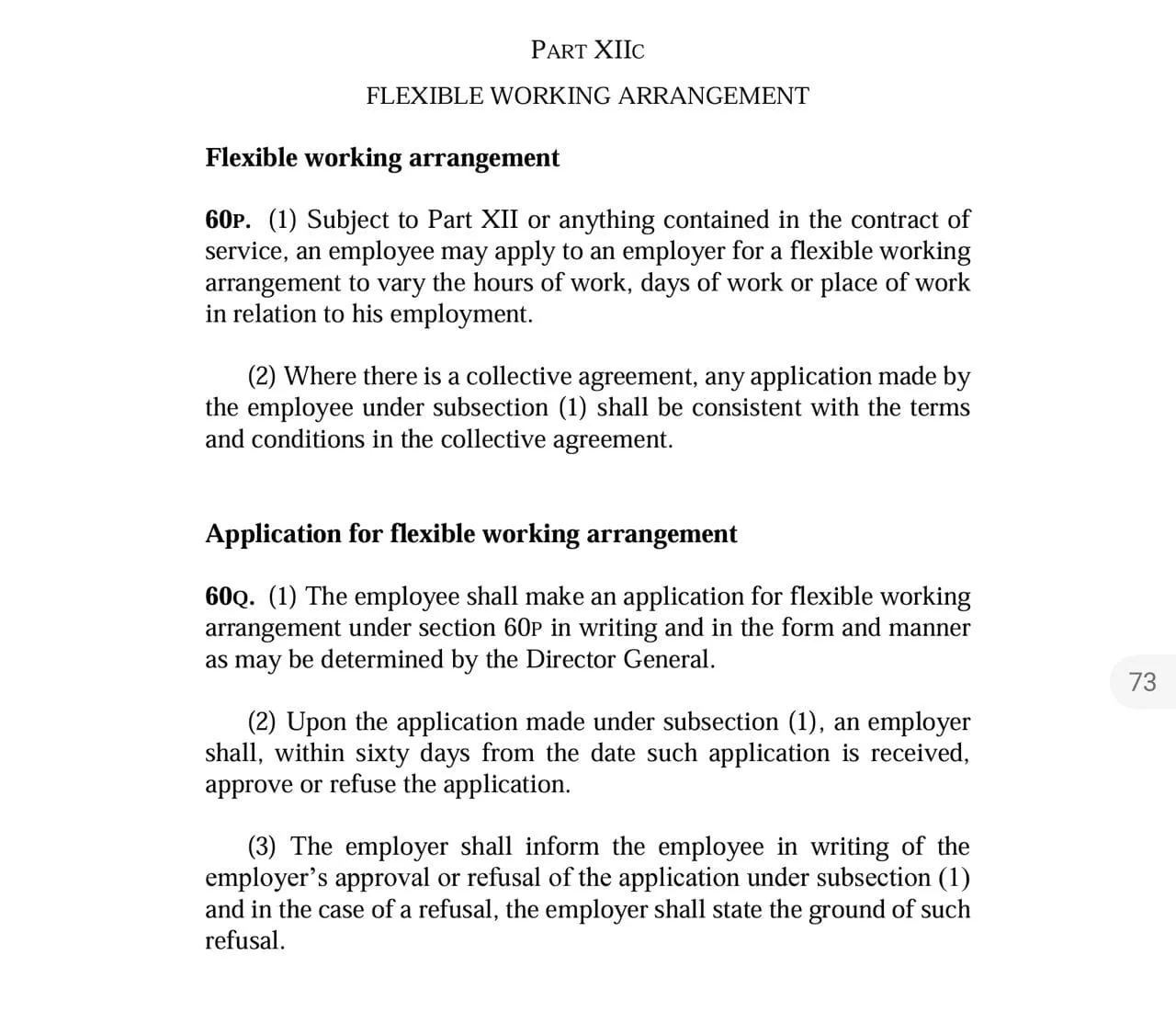 According to Section 60P (1) of the act, an employee has the right to request a flexible working arrangement from their employer to change the hours of work, days of work, or place of work related to his employment, subject to Part XII or anything specified in the contract of service.