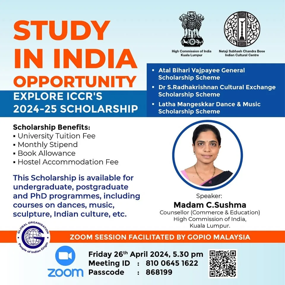 Are you a Malaysian student with a thirst for knowledge? If so, mark your calendars for an enriching Zoom session hosted by the Global Organization of People of Indian Origin (GOPIO). The event will take place on April 26, 2024, at 05:30 PM on Zoom and will delve into the diverse array of scholarships offered by the Indian Council for Cultural Relations (ICCR), tailored specifically for students like you.