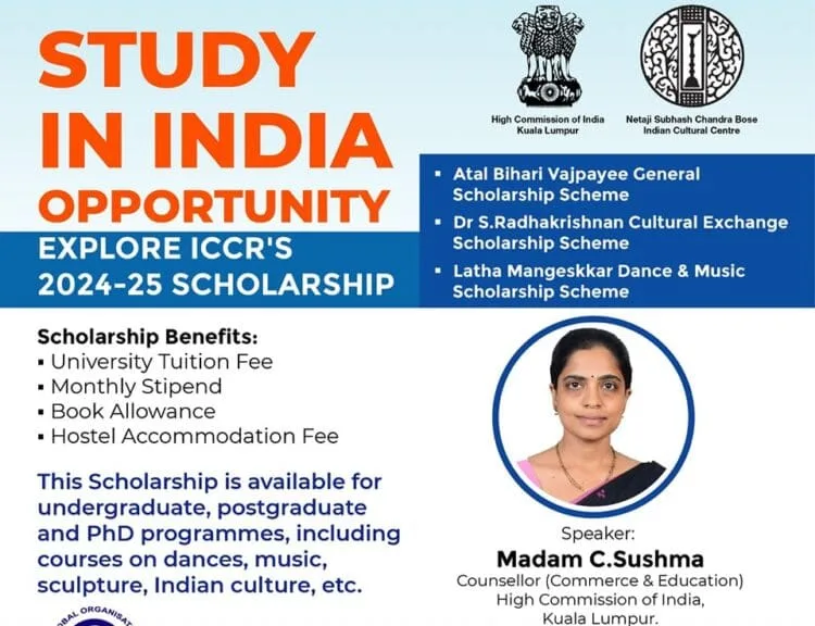Led by Madam C. Sushma, Counsellor of Commerce and Education at the High Commission of India, this session promises valuable insights into undergraduate, postgraduate, and Ph.D. opportunities available for Malaysian students across various fields. The scholarships offered by ICCR come with a plethora of benefits, including coverage of university tuition fees, monthly stipends, book allowances, and hostel accommodation fees.