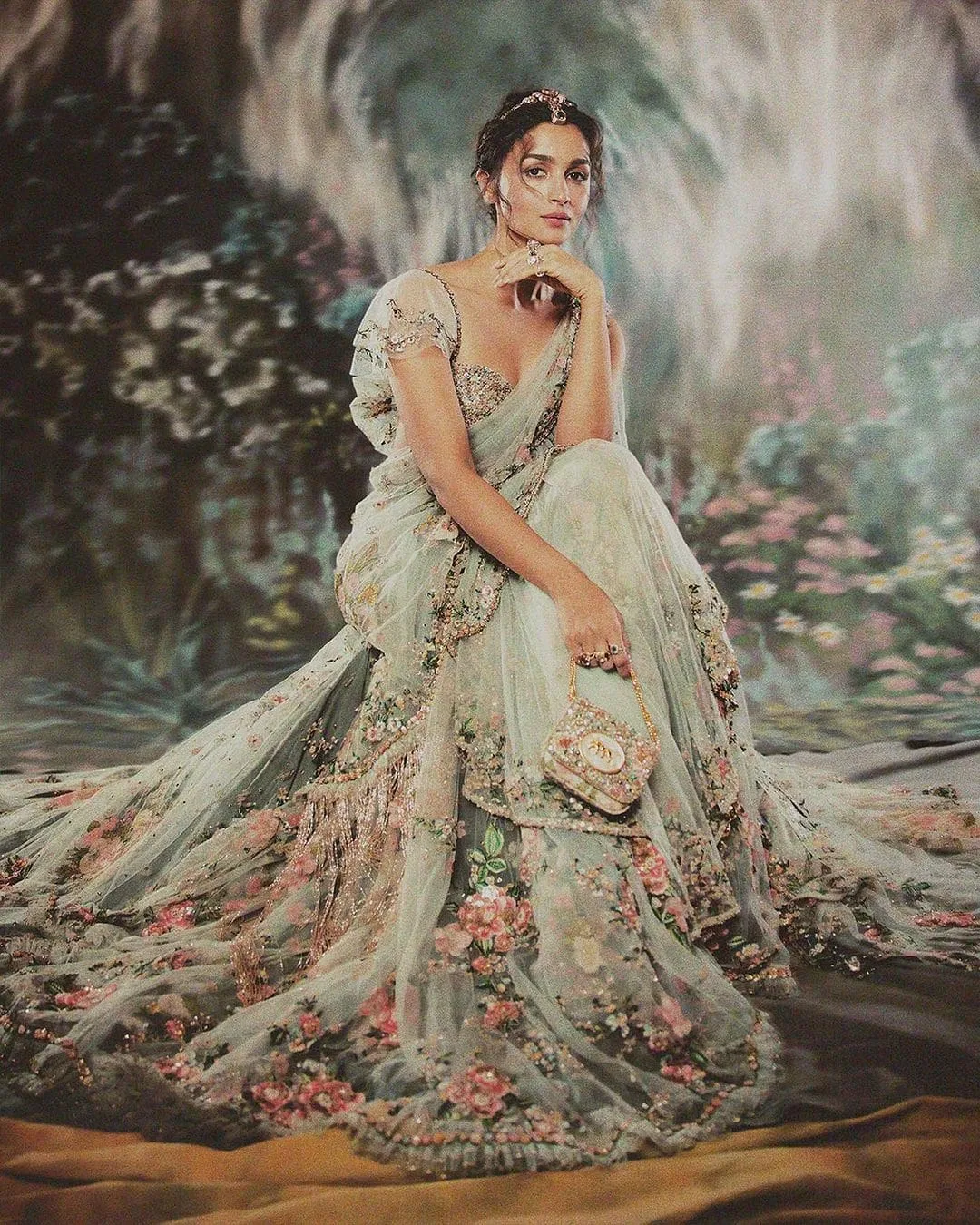 Alia’s saree was custom made with hand embroidered with silk floss, beads, sequins, semi precious stones and glass beads. Her blouse was also hand crafted with emeralds, pearls, tourmalines and multi colored sapphires.