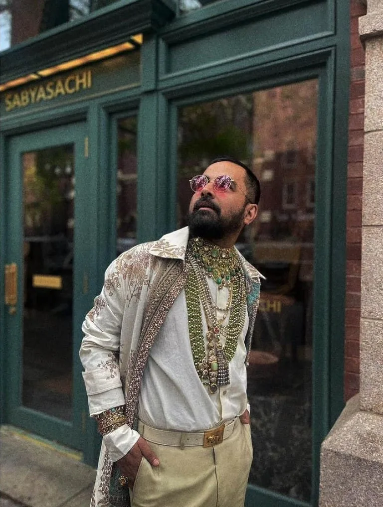 Sabyasachi looked effortlessly stylish for the occasion, showcasing his impeccable taste in fashion. He made a bold fashion statement by wearing an embroidered cotton duster coat layered with tourmalines from his iconic Sabyasachi Resort 2024 collection, paired with a classic white shirt and beige pants. The stunning collection of tourmalines, pearls, emeralds, and diamonds from the Sabyasachi High Jewellery brand combined in his attire. He completed the ensemble with a matching belt, stylish shades, and well-groomed brown shoes. His entire outfit exuded a royal and classy vibe.