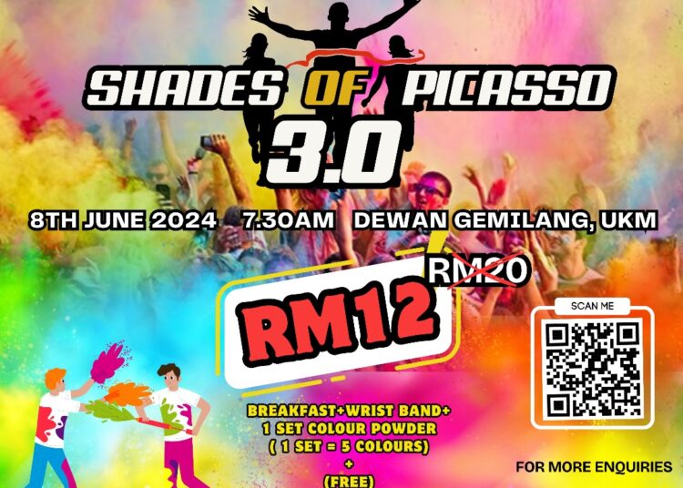 The Sentamil Kalagam Club at Universiti Kebangsaan Malaysia (UKM) is excited to announce Shades of Picasso 3.0, taking place on June 8th, 2024, at 7:30 AM in UKM’s Gemilang Hall. This dynamic event will feature an optional running section, a vibrant colour blasting event, and engaging game booths.