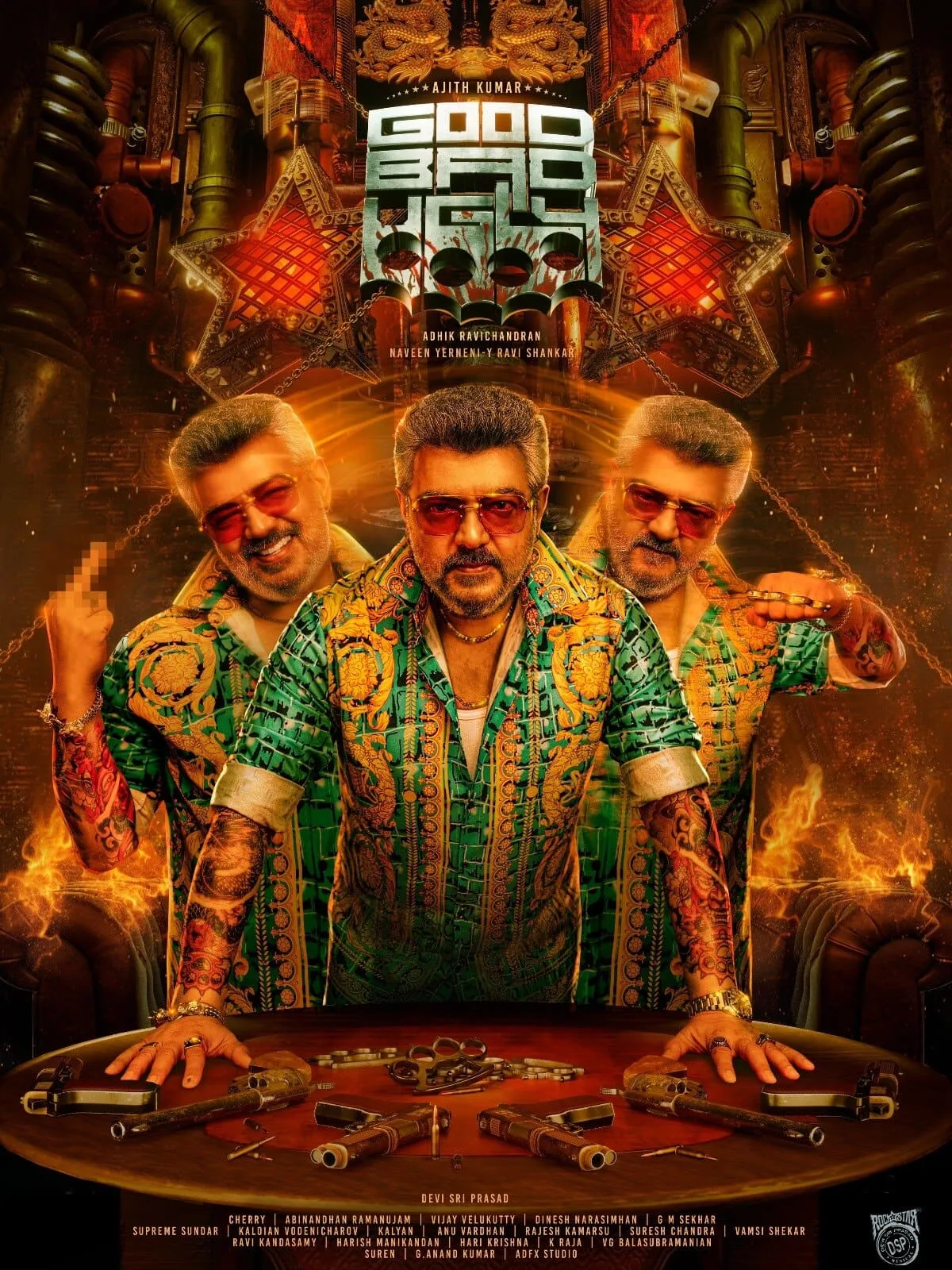 The first look poster showcases AK in a never-before-seen avatar, flaunting a vibrant, funky style that perfectly aligns with the film’s title. The poster presents Ajith in three distinct moods, embodying the ‘Good,’ ‘Bad,’ and ‘Ugly’ aspects of his character. Sporting a green shirt adorned with gold dragon prints, Ajith exudes swagger with his salt-and-pepper look, complete with a beard and shades. His tattooed arms, dragon-themed bracelet, and assortment of guns on the table suggest a thrilling and edgy storyline. We all know Ajith is popularly known for his double and triple roles in the films Varalaru, Billa, and Valli. This first look sparks excitement as it marks a comeback for him after a huge gap of playing triple roles.