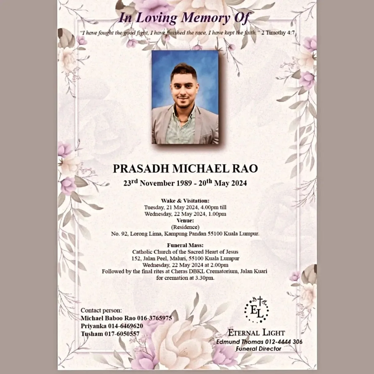 Prasadh’s wake will be held at 92, Lorong Lima, Kampung Pandan, Kuala Lumpur, starting from 4 p.m. today until 1 p.m. tomorrow. The funeral mass is scheduled for 2 p.m. tomorrow at the Catholic Church of the Sacred Heart of Jesus, Jalan Peel, Kuala Lumpur. The final rites will follow at the Kuala Lumpur City Hall crematorium in Cheras at 3.30 p.m.