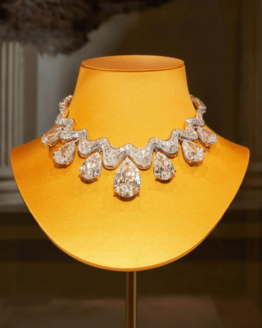 According to Bulgari’s official website, this extraordinary diamond necklace is crafted from a diamond sourced from Lesotho and is considered the most precious high jewelry piece ever created by Bulgari. The necklace required over 2,800 hours of craftsmanship and features a rough diamond exceeding 200 carats, delicately cut to create seven pear-shaped drops totaling 140 carats, symbolizing the 140th year of the brand’s history. The necklace is encased in a sinuous three-dimensional wave structure made of platinum and adorned with 698 diamonds weighing 61.81 carats. Which makes the necklace worth of 43 Million ( over 350 crores ).