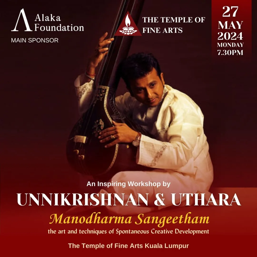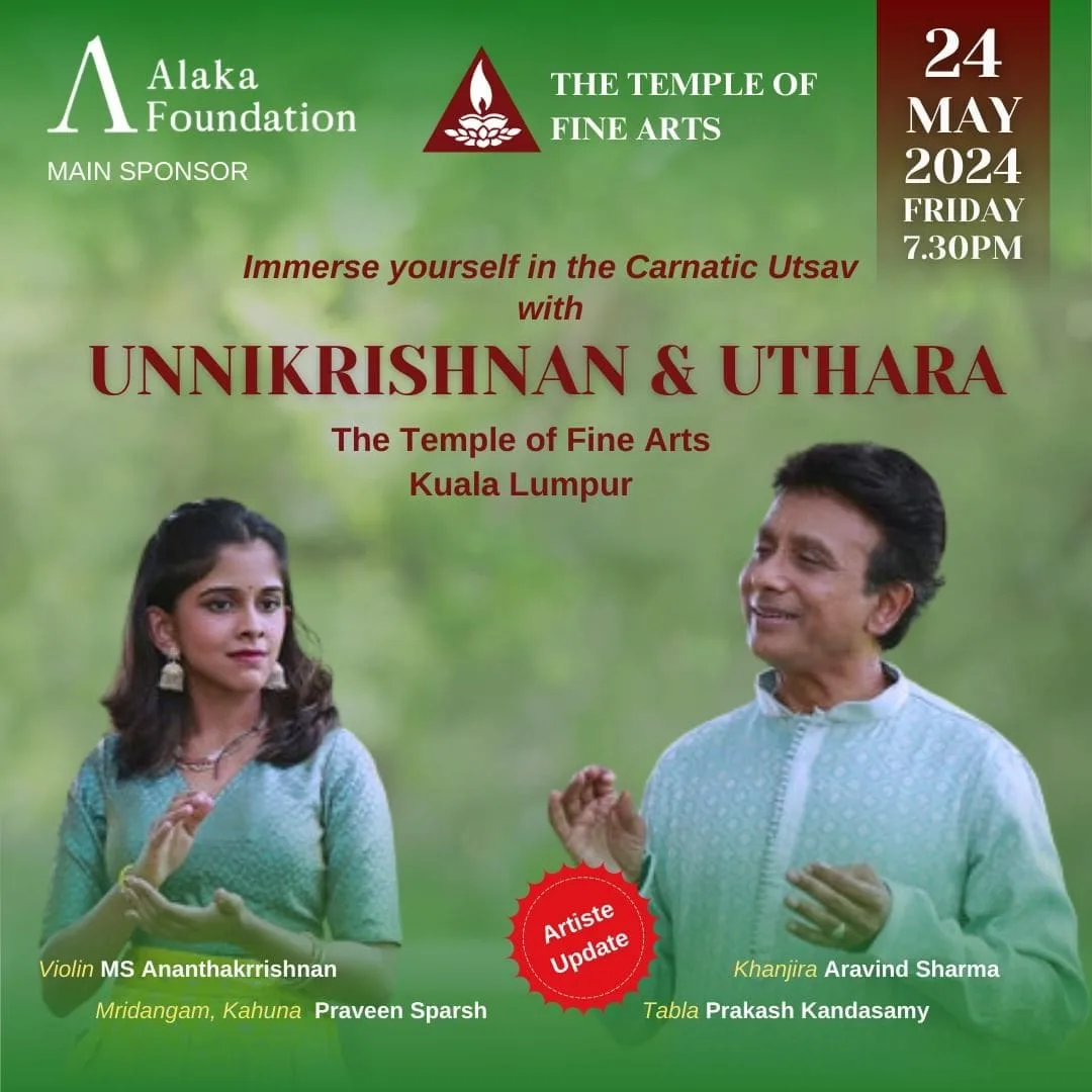 Yesterday, at the press conference for the event, Unnikrishnan expressed his gratitude to the Temple of Fine Arts for inviting them. He said it has been a beautiful journey working with the Temple of Fine Arts, especially in collaboration with Mr. Amalan. He praised the meticulous coordination involved in organizing the event and expressed his pleasure in working with the musicians from the Temple of Fine Arts. Meanwhile, Uthara expressed her excitement about performing for the audience. This is her first time in Malaysia and her first time performing with her father. She hopes everyone will enjoy the three-day event they have planned.