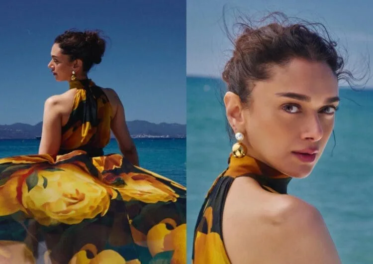 Aditi’s first look at Cannes was a beautiful yellow and black dress by Gauri and Nainika, embodying the perfect summer style. The dress featured a long, flared pattern at the back and a floral design that was both refreshing and vibrant. Her minimal yet impactful accessories included gold-toned earrings, and she styled her hair in a chic messy bun. With nude tinted lips, fresh blush, and dewy glam makeup, Aditi’s beauty game was on point, enhancing her overall summer aesthetic.