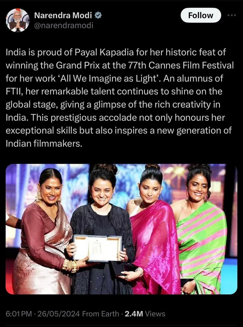“India is proud of Payal Kapadia for her historic win of the Grand Prix at the 77th Cannes Film Festival for her film ‘All We Imagine as Light’. Her exceptional skill continues to shine on the global stage as an FTII alumnus, revealing India’s abundant inventiveness. This distinguished award not only recognizes her extraordinary abilities, but also inspires a new generation of Indian filmmakers,” the Prime Minister wrote on his X social media page.