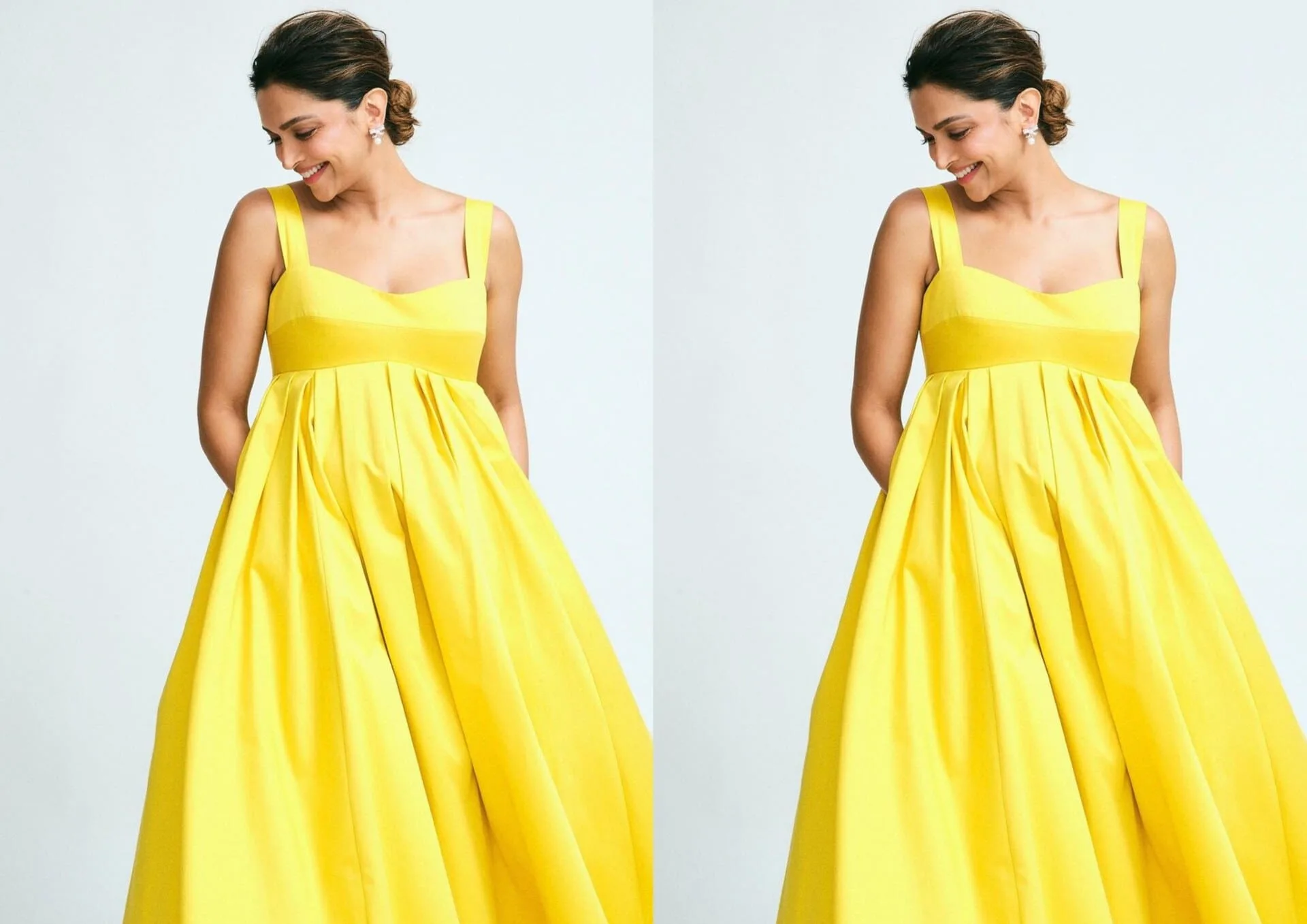 In a more casual yet equally charming appearance, Deepika Padukone wore a beautiful yellow flowy dress designed by Gauri and Nainika while attending the launch of her skincare brand 82°E in Mumbai. The dress highlighted her glowing pregnancy and elevated her charming personality. Deepika later put the dress on sale for charity, with proceeds supporting The Live Love Laugh Foundation. The dress sold for Rs 34,000 within 20 minutes, showcasing her continued commitment to philanthropy even during her pregnancy.