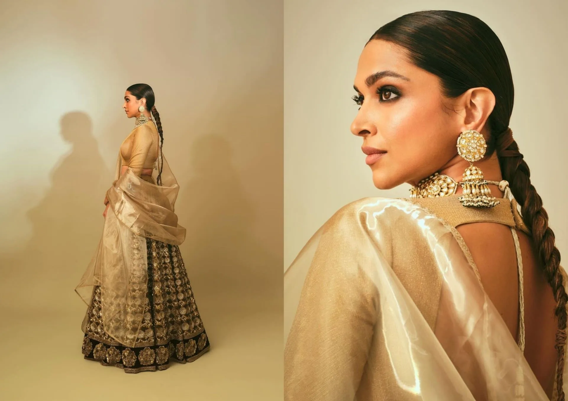 Deepika stole the show at Anant Ambani and Radhika Merchant’s luxurious pre-wedding event, dressed in a regal golden Sabyasachi lehenga. The elaborately embroidered lehenga, worn with a backless beige-gold top and a matching gold tissue dupatta, gave off a dreamy vibe. Her attire was complemented with traditional jhumka and chocker. Her silky long braid, smokey eyes, and rosy-brown nude lips contributed to her beautiful appearance, confirming once more that she is one of Bollywood’s most graceful leading women.