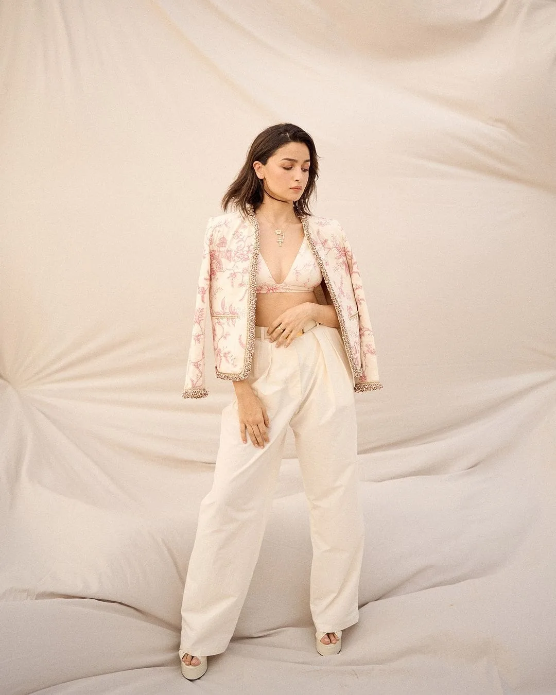 In her latest appearance, Alia wore a unmatched glamour in an off-white deep V-neck bralette adorned with a pink floral print, paired with high-waisted matching pants. The ensemble are from the shelves of India’s Best designer Sabyasachi and is further accentuated by a statement Sabyasachi belt and a matching full-sleeve jacket featuring embellished borders. The combination of exquisite craftsmanship and intricate detailing in the outfit reflects the designer’s signature styles.