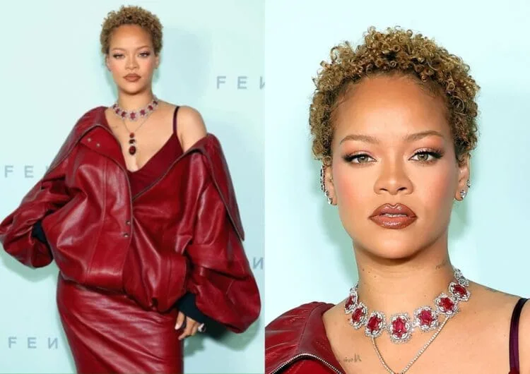 Dressed in a maroon-red leather jacket and skirt set, Rihanna’s ensemble was complemented by a suite of ruby necklaces. The standout piece was a stunning ruby choker crafted by Bollywood’s go-to costume designer and bridal couturier, Manish Malhotra. The choker, made of 18-karat gold and encrusted with custom-cut diamonds, showcased the intricate artistry and heritage of Indian jewellery design.