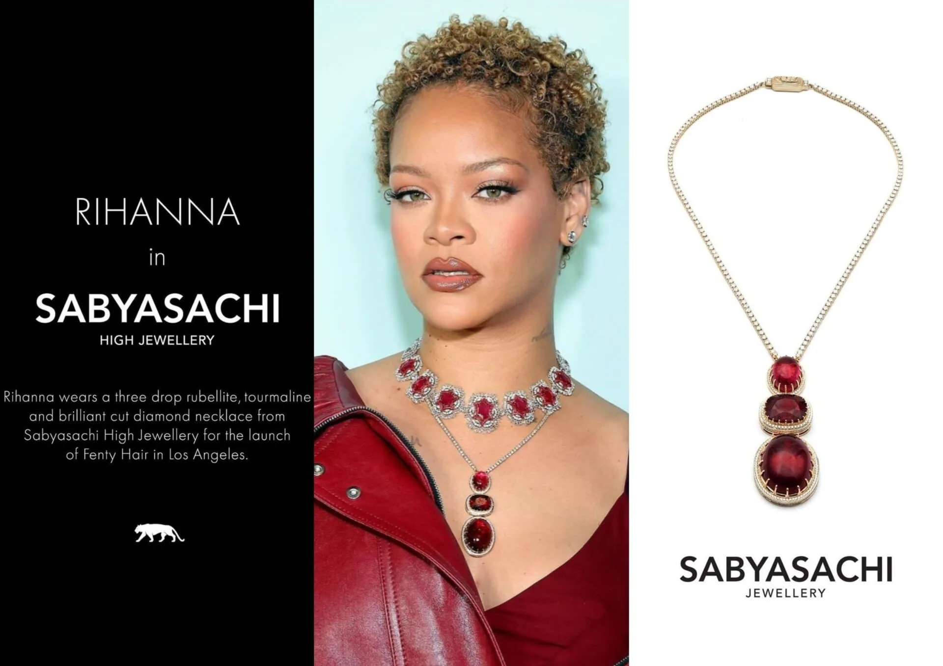 At the Fenty Hair launch, Rihanna’s jewellery choices didn’t stop at the ruby choker. She also wore a state-of-the-art necklace from Sabyasachi Mukherjee featuring three drop rubellite, tourmaline and brilliant cut diamonds. Styled by Jahleel Weaver, Rihanna’s look was a harmonious blend of contemporary fashion and traditional Indian artistry, exuding opulence and sophistication.