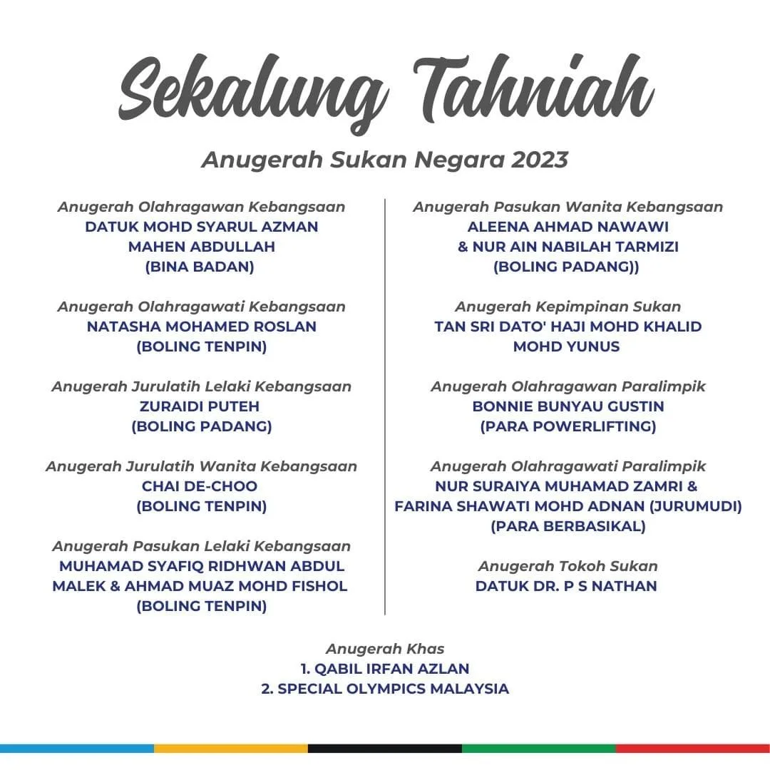 Congratulations to the athletes for their remarkable achievements at the 2023 National Sports Awards. They truly serve as the pride of our nation, inspiring generations with their dedication, skill, and unwavering commitment to excellence in their respective sports. Their triumphs not only bring honor to themselves but also shine a spotlight on Malaysia’s thriving sporting talents. We celebrate their success and look forward to their continued contributions to the sporting landscape of Malaysia.