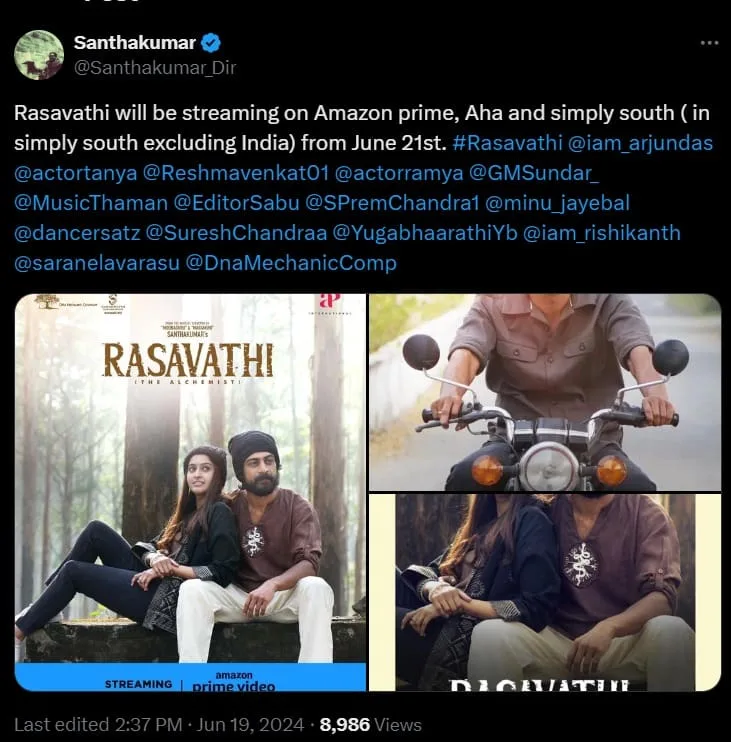 Directed by Santhakumar, Rasavathi will be available for streaming on Amazon Prime , Aha and Simply South (excluding India) starting today 21st June. This announcement was made by Santhakumar himself on his social media platform, X where he wrote,