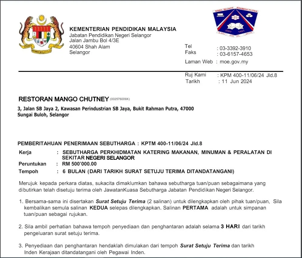 Mango Chutney’s founder, C. Suhashini, explained that the scammer, posing as a representative from the Ministry of Education, contacted them via WhatsApp and presented a fake letter on June 11th. The scammer requested catering services for 60 teachers from SMK Bukit Rahman Putra in Sungai Buloh.